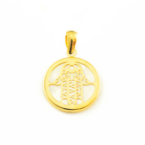 Shiny Fatima Hand Round Mother of Pearl 18K Yellow Gold Pendant