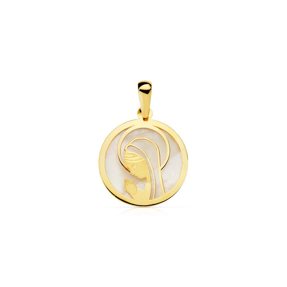 18K Yellow Gold Pendant Mother of Pearl Round Virgin Girl Matte and Shine