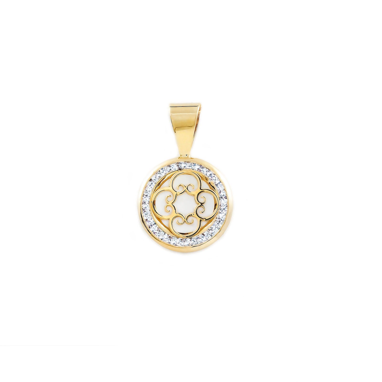 9K Yellow Gold Pendant Mother of Pearl Round Shiny Zirconia Spirals