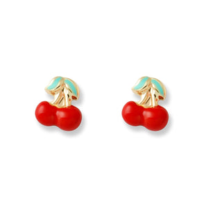 Baby-Girl Earrings 18K Yellow Gold Cherries Red-Green Glossy Enamel