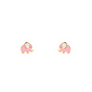 Baby-Girl Earrings 18K Yellow Gold Elephant Pink-White Glossy Enamel