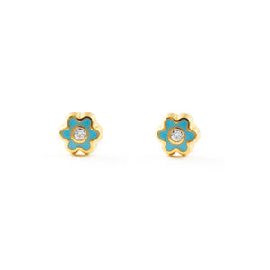 Baby-Girl Earrings 18K Yellow Gold Daisy Flower Blue Enamel Shiny Zirconia