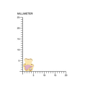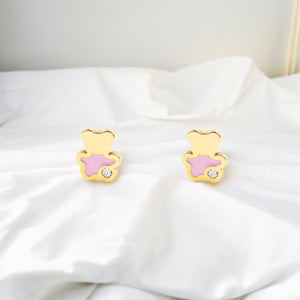 18K Yellow Gold Baby Girl Earrings Pink Enamel Bear with Shiny Zirconia