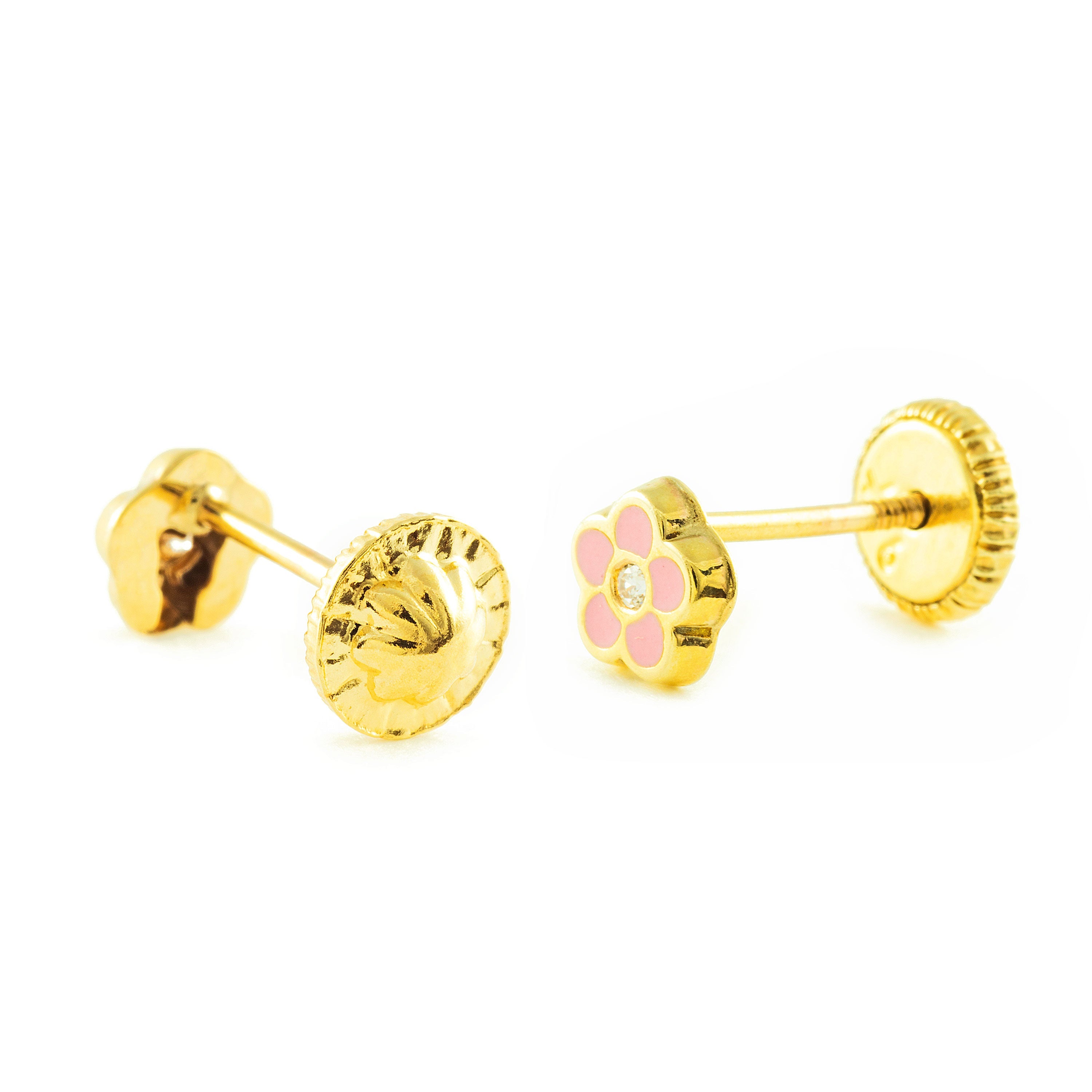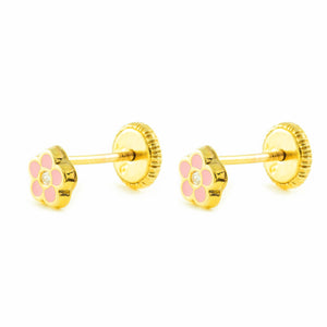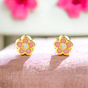 9K Yellow Gold Baby Girl Earrings with Daisy Flower and Light Pink Shiny Enamel