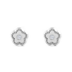 Baby-Girl Earrings 9K White Gold Daisy Flower Zircon Shine and Texture
