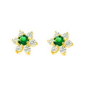 Women's-Girl's Earrings 9K Yellow Gold Shiny Emerald Zirconia Flower