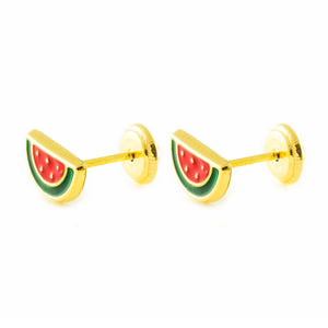 Girl's Earrings 18K Yellow Gold Watermelon Red-Green Glossy Enamel