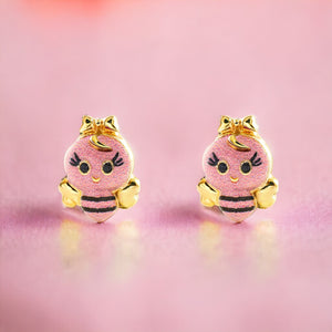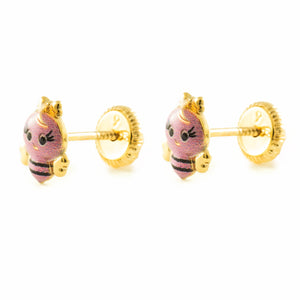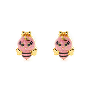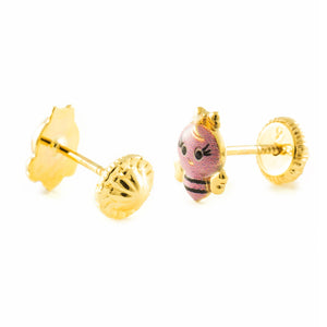 9K Yellow Gold Bee Girl's Earrings with Light Pink Glossy Enamel