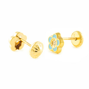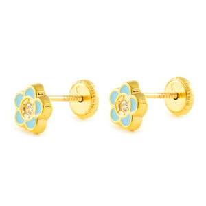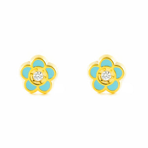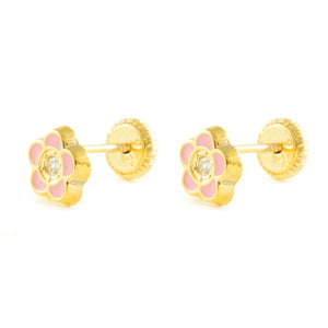Girl's Earrings 9K Yellow Gold Flower Enamel Shiny Zirconia