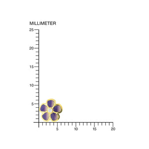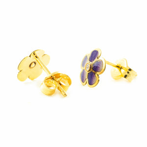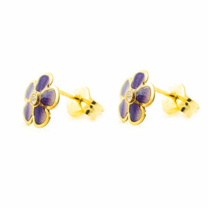 Girl's Earrings 9K Yellow Gold Flower Purple Enamel Shiny Zirconia