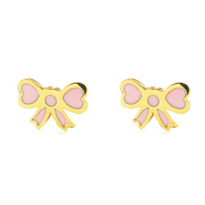 Girl's Earrings 9K Yellow Gold Shiny Pink Enamel Bow