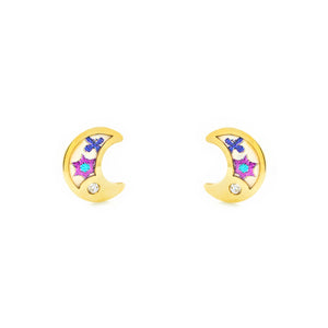 Girl's Earrings 9K Yellow Gold Moon Multicolor Enamel Shiny Zirconia