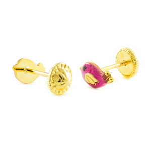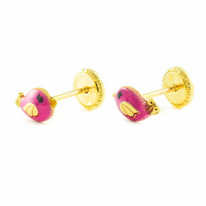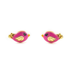 9K Yellow Gold Girl's Earrings Bird Intense Pink Shine Enamel