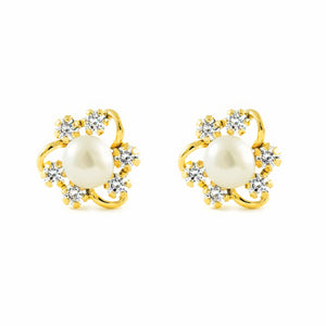 Girl's Earrings 9K Yellow Gold Button Pearl 4.5 mm Shiny Zirconia