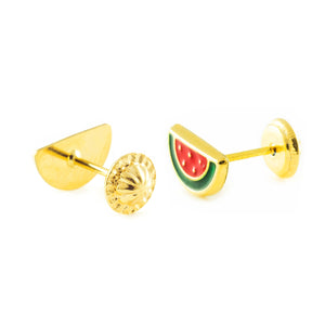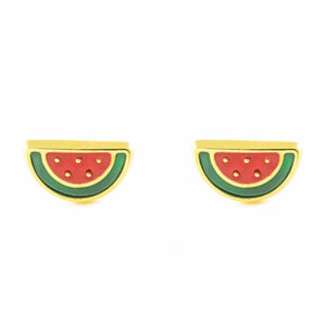 Girl's Earrings 9K Yellow Gold Watermelon Red-Green Glossy Enamel