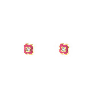 Girl's Earrings 9K Yellow Gold Clover Pink Enamel Shiny Zirconia