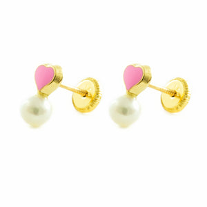 9 Carat Gold Earrings (375/1000) Heart Pink Enamel Round Pearl 4 mm