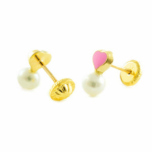 Girl's Earrings 9K Yellow Gold You and Me Round Pearl 4 mm Shiny Pink Heart