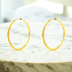 18K Yellow Gold Earrings Square Carved Hoops 35 x 1.5 mm