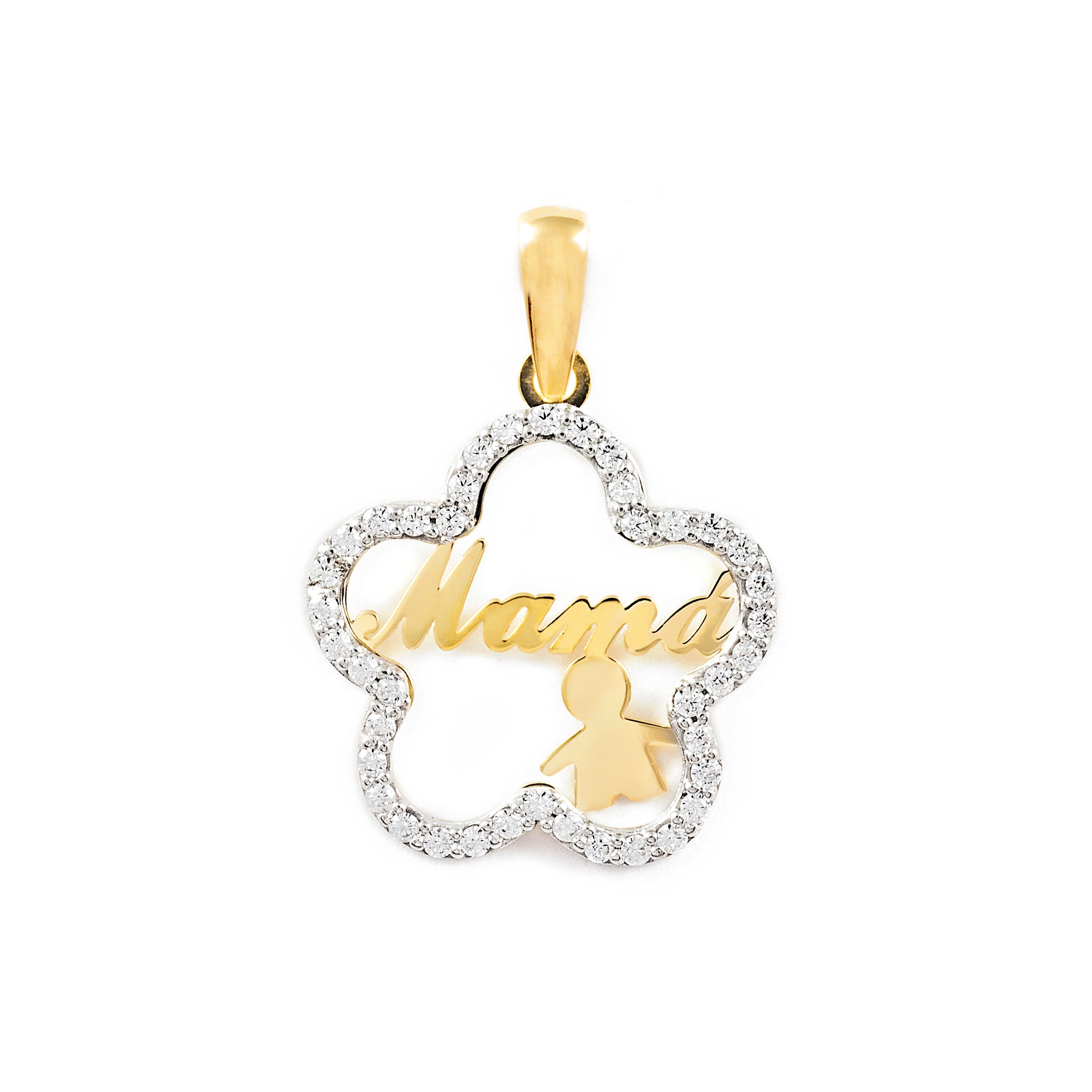Colgante Oro Bicolor 18K Flor Mama y Niño Circonitas Brillo