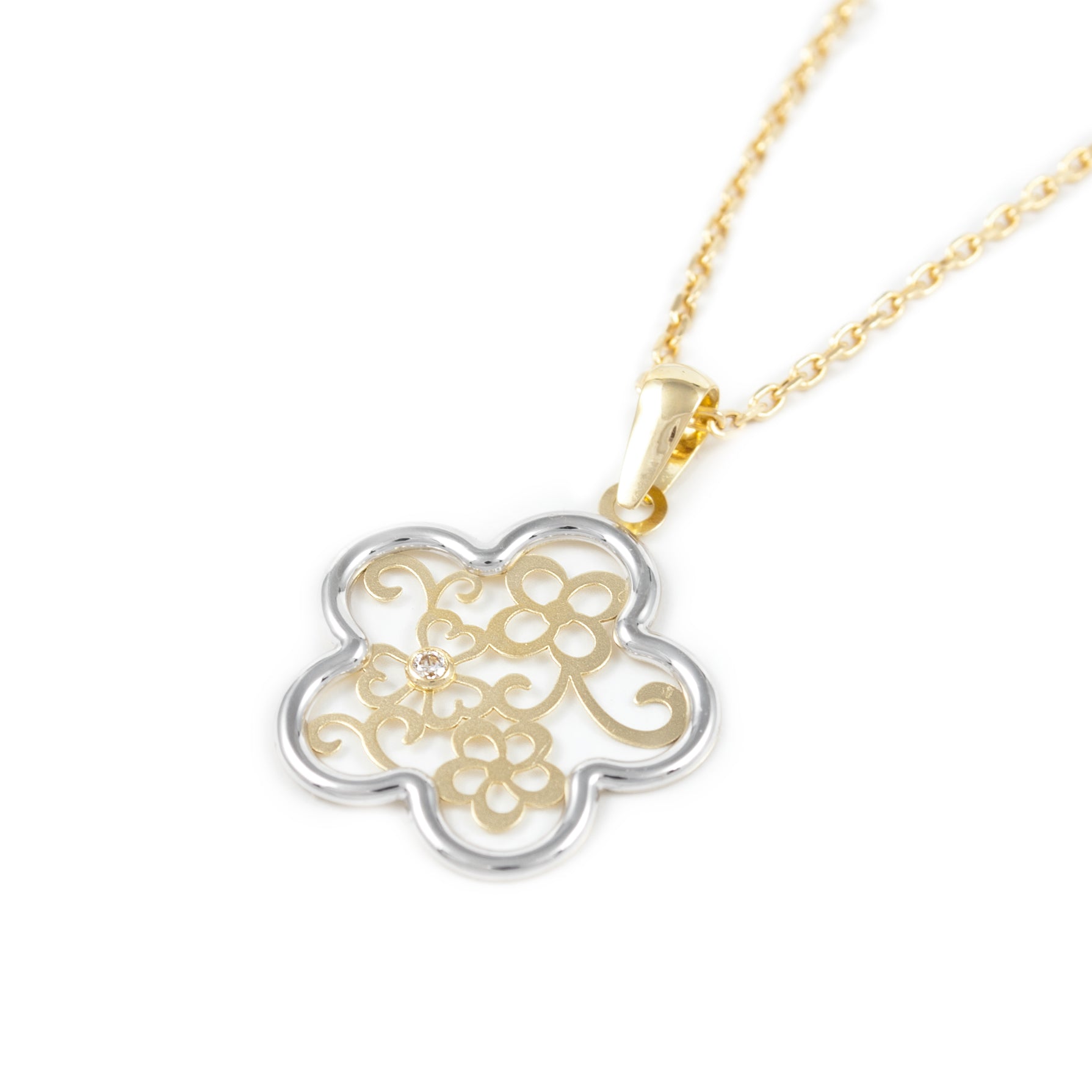 Colgante Oro Bicolor 18K Flor Treboles Circonita Mate y Brillo