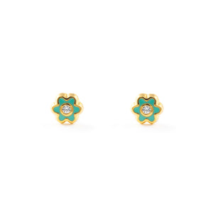 Pendientes Bebe/Niña Oro 18 Quilates (750/1000) Flor Circonita Esmalte Verde