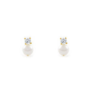 Pendientes Niña Oro Amarillo 18K Tu y Yo Perla Redonda 4 mm Circonita Brillo