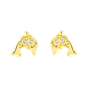 Pendientes Niña Oro Amarillo 9K Delfín Circonitas Brillo