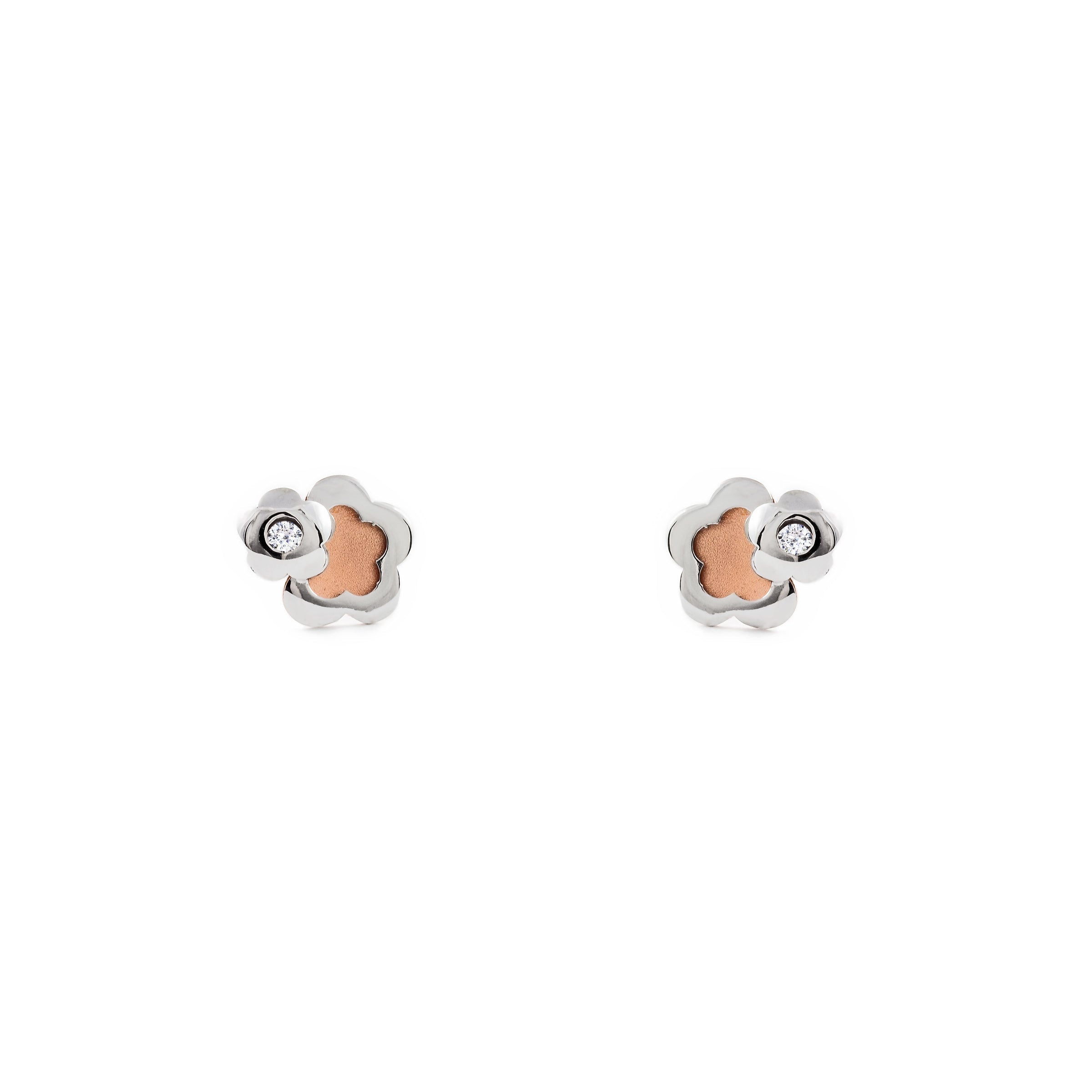 Pendientes Niña Oro Bicolor 9 Quilates (375/1000) Flor Circonita Mate y Brillo