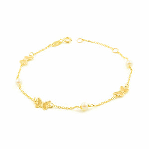 Pulsera Mujer-Niña Oro Amarillo 9K Perla Redonda 3,5 mm Mariposas Mate y Brillo 18 cm