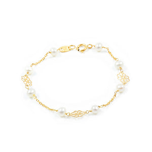 Pulsera Niña Oro Amarillo 18K Perla Redonda 3,5 mm Flores Brillo 13 cm