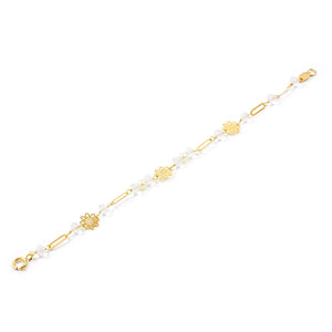 Pulsera Niña Oro Amarillo 18K Perla Redonda 3,5 mm Flores Rosa Brillo 13 cm