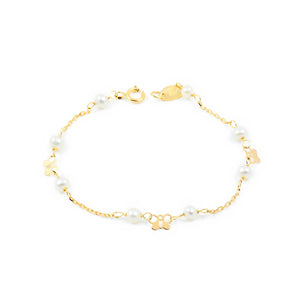 Pulsera Niña Oro Amarillo 18K Perla Redonda 3 mm Mariposa Brillo 13 cm