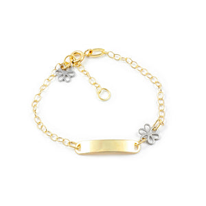 Pulsera Niña Oro Bicolor 18K Personalizada Esclava Flor Margarita Brillo 14 cm